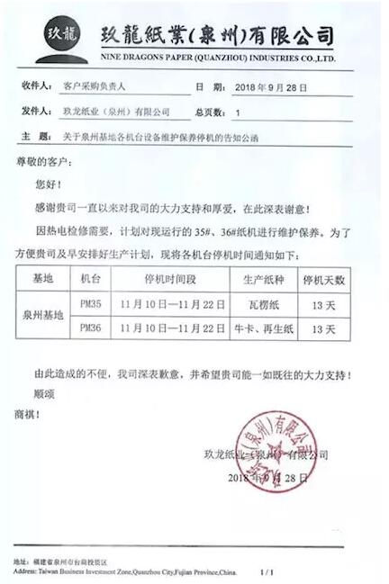 泉州玖龍發(fā)布公告,35#、36#紙機(jī)11月10日-22日停機(jī)檢修13天 不久前,泉州玖龍的停機(jī)檢修公告也引發(fā)了行業(yè)關(guān)注。 玖龍紙業(yè)(泉州)有限公司: 因熱電檢修需要,計(jì)劃對現(xiàn)運(yùn)行的35#、36#紙機(jī)進(jìn)行維護(hù)保養(yǎng),為了方便貴司及早安排好生產(chǎn)計(jì)劃,現(xiàn)將各機(jī)臺(tái)停機(jī)時(shí)間通知如下: PM35:11月10日-11月22日停機(jī)13天(生產(chǎn)紙種:瓦楞紙) PM36:11月10日-11月22日停機(jī)13天(生產(chǎn)紙種:牛卡、再生紙)