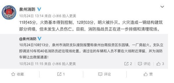 導語:10月24日早上,福建泉州福源紙箱廠著火,一鋼結構建筑部分坍塌,但未發生人員傷亡。不想讓火災光顧,紙箱廠切記做好防范工作。 福源紙箱廠突發大火,造成一鋼結構建筑部分坍塌 10月24日早上,福建泉州臺商投資區的福源紙箱廠著火。10時13分,泉州市消防支隊接到報警,調派10車和40名消防員趕往現場。11時45分,火勢基本得到控制,12時03分,明火被撲滅。 火災造成一鋼結構建筑部分坍塌,但未發生人員傷亡。13時14分,泉州消防發布微博稱消防仍在進一步排煙和清理現場。