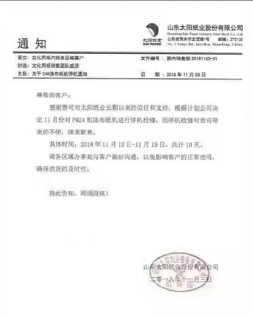 在2018年11月10日-11月19日期間,涂布紙機PM24停機10天。