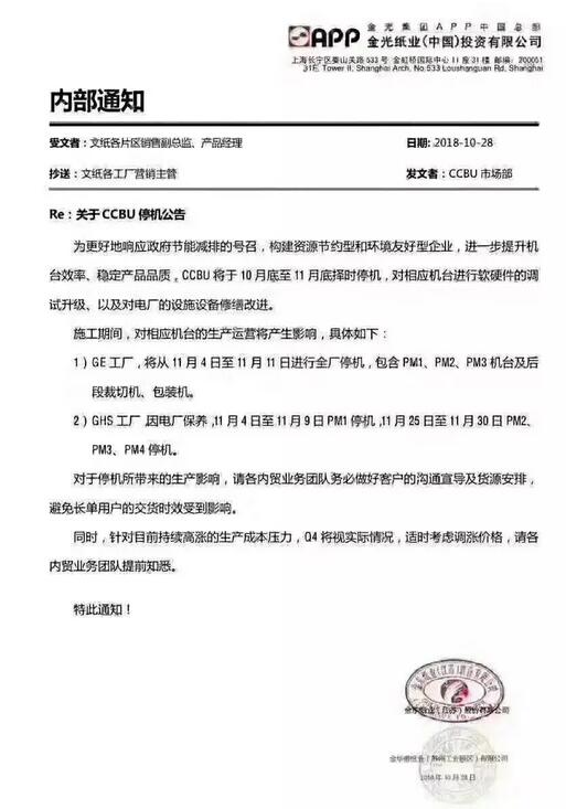 自11月1日起,銅版紙工廠停機10天;11月11日起,美倫工廠停機10天。