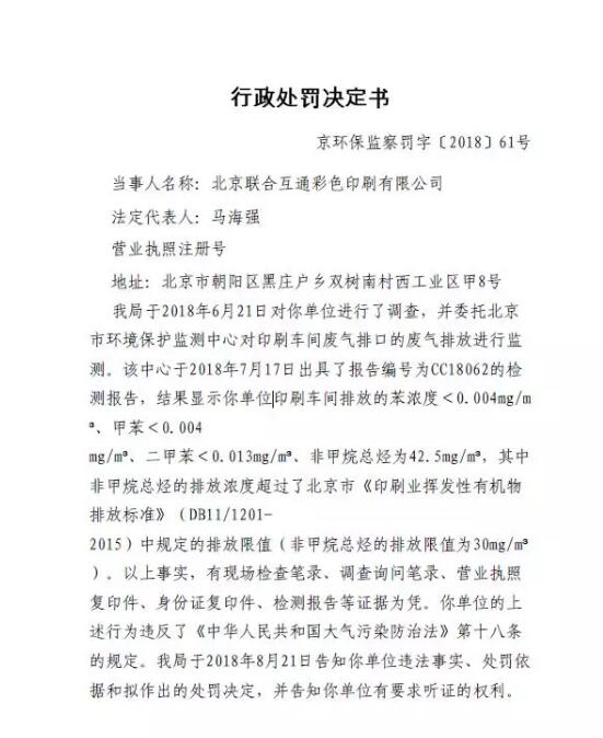 【摘要】北京環境保護局在近期發布了一份行政處罰決定書。文件顯示,北京聯合互通彩色印刷有限公司的印刷車間因廢氣排放超標,被罰款十萬元。 北京環境保護局于2018年10月18日發布了京環保監察罰字〔2018〕61號行政處罰決定書,該文件顯示,北京聯合互通彩色印刷有限公司因廢氣排放超標,被處十萬元罰款,并責令其立即改正違法行為。 之前,北京市環境保護監測中心于2018年6月21日對該企業印刷車間廢氣排口的廢氣排放進行了監測,該中心于2018年7月17日出具了報告編號為CC18062的檢測報告,結果顯示,單位印刷車間排放的苯濃度<0.004mg/m3、甲苯<0.004mg/m3、二甲苯<0.013mg/m3、非甲烷總烴為42.5mg/m3,其中非甲烷總烴的排放濃度超過了北京市《印刷業揮發性有機物排放標準》(DB11/1201-2015)中規定的排放限值(非甲烷總烴的排放限值為30mg/m3)。