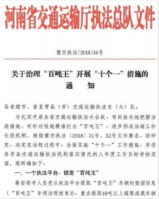 河南:嚴格落實“十個一”工作方案 11月初,河南省省交通運輸廳執法總隊下發《關于治理“百噸王”開展“十個一”措施的通知》(以下簡稱《通知》),要求全省各級交通運輸執法機構按照“十個一”要求,嚴打“百噸王”。