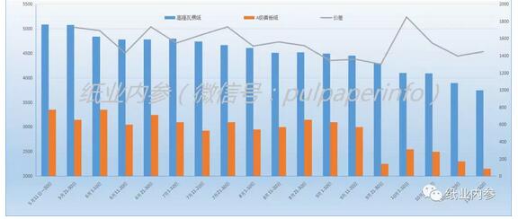 自今年下半年以來,國家統計局共12次公布重要生產資料市場價格變動,其中高瓦的價格11次出現下跌,僅8月中旬有一次小幅的反彈。9月中旬以后,紙價下降的幅度明顯加快,9月份至今的紙價跌幅已超過千元。