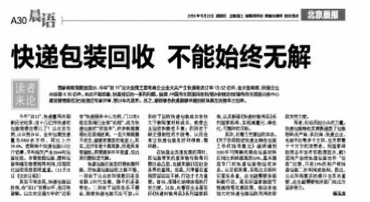 快遞包裝應該走好綠色循環路。而快遞包裝回收之路不暢,一則在于公眾的環保意識還沒有跟上時代發展,隨手扔還是常態;二則在于回收體系不健全,致使快遞包裝無處可放;三則在于回收快遞包裝成本往往大于新購置材料成本,致使企業回收積極性不高;四則在于缺乏強制性的手段等,從而沒有讓快遞包裝走好環保路、循環路。