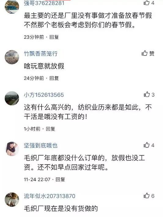 網友:擔心一下春節何時收到上班通知![流淚] 網友:我覺得應該是2月1日開始放假、辦公室或者后勤人員打錯的、不可能從12月開始放假的、春節! 網友:我們公司就是趁國慶員工放假期間把廠搬走了,還不想賠錢,勞動仲裁結果還要下個禮拜才出,老板詭計多端,估計仲裁也不會有什么好結果,正準備起訴到法院! 網友:紡織從業人員為你們解答!廣東,浙江,江蘇這三個省份紡織行業很多,今年年初受到外貿影響加上內地市場不景氣,今年的實業格外難做!張家港有些制造廠十一月初就放假了!現在人工成本很高,因為這行很累,已經很少年輕人做這一行了。利潤很低,你不做別人做,價格已經做臭了!現在做這一行真的很累!