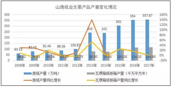 制圖:金融界上市公司研究院,數據來源:山鷹紙業公告 從上圖可以看出,2013年,也就是泰盛實業入主山鷹紙業后,產能出現了突破式發展。在經過一段時間的整合消化后,2015年,山鷹紙業馬鞍山年產80萬噸造紙項目及其配套工程完成工程建設并全部正式投產,產能得到進一步擴張。2016年,80萬噸造紙生產線產能進一步釋放,上市公司總產能再次提升。 進入2017年后,山鷹紙業經營整合、產能擴容、產業鏈拓展的步伐并沒有停下來。2017年,山鷹紙業收購北歐紙業Nordic公司。Nordic公司主要產品為防油紙與牛皮紙,擁有漿紙年產能約50萬噸,其防油紙產品在歐洲市場占有率居于首位。收購完成后其產品結構進一步完善。2017年底,上市公司收購福建省聯盛紙業有限責任公司100%股權,并在2018年初完成并表。聯盛紙業是一家以廢紙為主要原材料,生產高強度瓦楞紙和牛皮箱板紙為主的包裝紙造紙生產企業,年產能約105萬噸。 目前,山鷹紙業還擁有在建的華中包裝紙項目,在這一項目產能到位后,山鷹紙業總產能將攀升至630萬噸,達到目前包裝紙生產產能排名第二的理文造紙的產能規模水平。