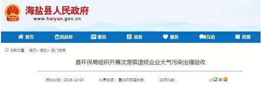 導語:為進一步治氣改善環境空氣質量,保障人民群眾身體健康,浙江省嘉興市海鹽縣環保局積極推進沈蕩工業企業大氣污染治理工作,近日,海鹽縣環保局、沈蕩鎮和浙江大學工業生態與環境研究所組成驗收組,對沈蕩鎮重點行業四家造紙企業進行大氣污染治理驗收。