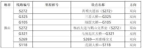 5月15日,佛山市首個地方公路科技治超點高明合和大道科技治超點正式投入使用。12月14日,佛山市第二批科技治超點正式投用!分布在S269-三水二橋、S269-三茂鐵路橋、S118-油金大橋。 交警將對超載超限車輛作出記3分扣200元的處罰。 根據部署,佛山近期還將建設以下7處監測點: