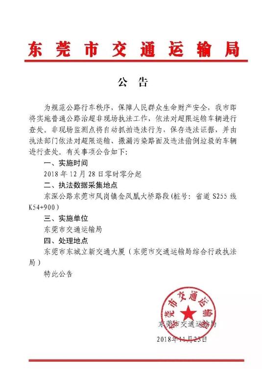 東莞市交通運輸局發布公告,將于12月28日零時零分起,開始實施普通公路治超非現場執法工作,依法對超限運輸車輛進行查處!