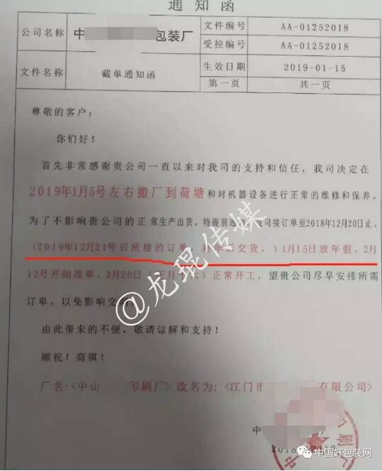 而在12月10日,中山市一家紙箱廠表示,接訂單至2018年12月20日止。2018年12月21日后所接訂單,將年后交貨。2019年1月15日開始放年假,2月12號開始接單,2月20日正式開工。
