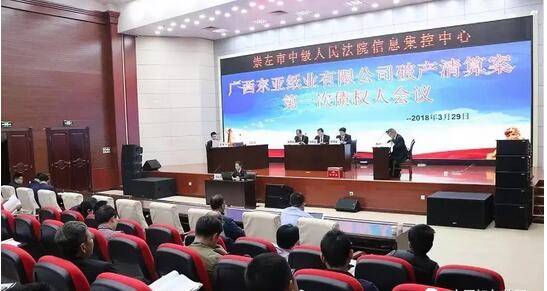 2、廣西東亞紙業有限公司 2018年3月29日,崇左市中級人民法院召開廣西東亞紙業有限公司破產清算第一次債權人會議。崇左中院執行局在執行申請人崇左桂南農商行與被執行人東亞紙業公司金融借款合同糾紛一案中,崇左桂南農商行以東亞紙業公司不能清償到期債務,明顯缺乏清償能力為由,向該局申請將案件移送破產審查。 經初步審查,截止2018年3月14日,東亞紙業公司共有債權人60人,向管理人申報債權77筆,申報債權總額共計3.9110億元。截止2016年10月,該公司資產評估值為3.0709億元,清算價值(司法處置價值)2.8897億元。