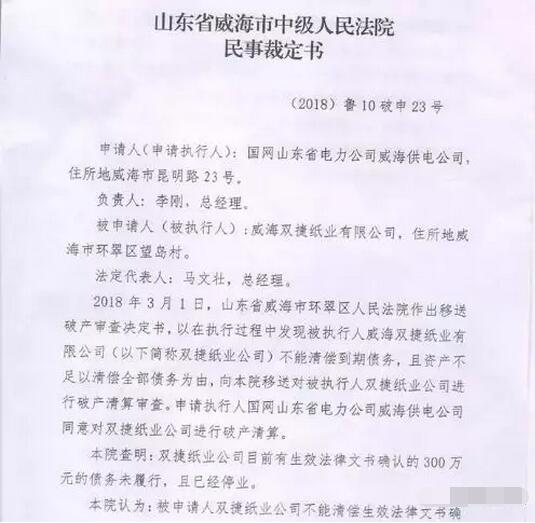 3、威海雙捷紙業有限公司 2018年3月1日,山東省威海市環翠區人民法院作出移送破產審查決定書,以在執行過程中發現被執行人威海市雙捷紙業有限公司不能清償到期債務,且資產不足以清償全部債務為由,向山東省威海市中級人民法院移送對被執行人雙捷紙業公司進行破產清算審查。 2018年7月10日,山東省威海市中級人民法院作出(2018)魯10破申23號民事裁定書,裁定受理債務人威雙捷紙業有限公司破產清算一案,并于2018年7月17日作出(2018)魯10民轄47號民事裁定書,裁定本案由威海市環翠區人民法院審理。