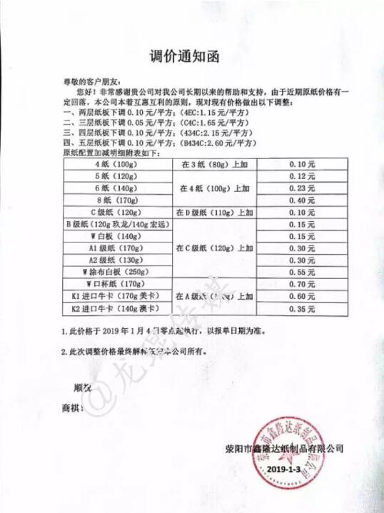 正值杭州富陽紙廠狂發(fā)白板紙漲價函之際,2019年1月3日,滎陽市鑫隆達(dá)紙制品有限公司發(fā)布降價函: 1、兩層紙板下調(diào)0.10元/平方:(4EC:1.15元/平方); 2、三層紙板下調(diào)0.05元/平方:(CAC:1.65元/平方); 3、四層紙板下調(diào)0.10元/平方:(434C:2.15元/平方); 4、五層紙板下調(diào)0.10元/平方:(B434C:2.60元/平方)。