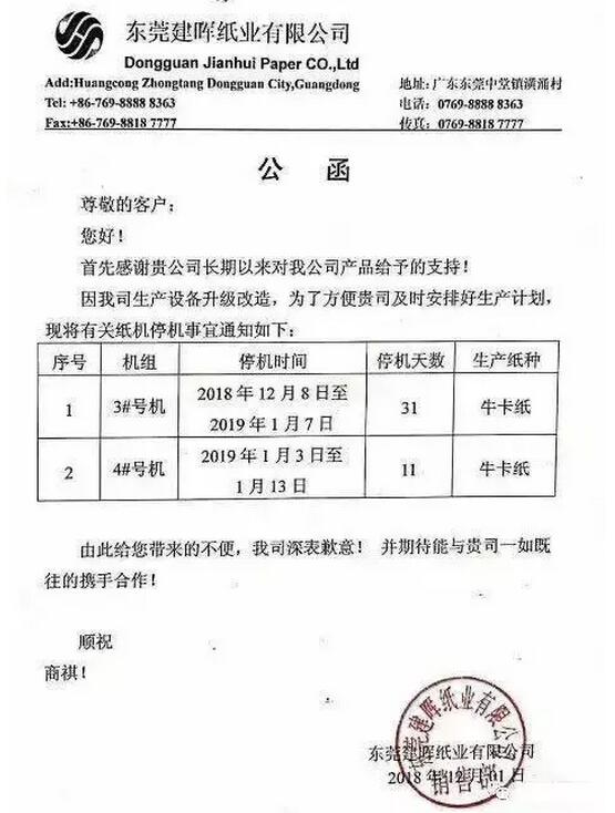12月1日,東莞建暉紙業(yè)有限公司對(duì)外公布,自12月8日起兩臺(tái)紙機(jī)開始輪流停機(jī),最長(zhǎng)停31天。其中3#機(jī)自2018年12月8日至2019年1月7日,停機(jī)31天,主要生產(chǎn)牛卡紙;4#機(jī)自2019年1月3日至2019年1月13日,停機(jī)11天,主要生產(chǎn)牛卡紙。