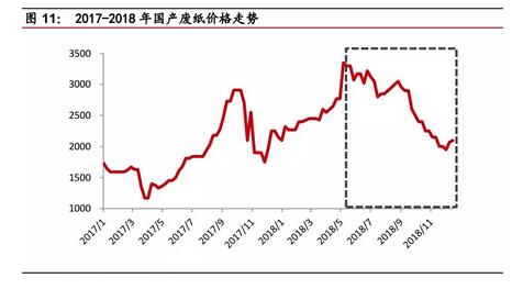 導語:國廢價格2018下半年開始震蕩下行,削弱了市場信心,那么,2019年國廢價格將繼續下行還是有上漲空間? 2018年國廢為什么處于下行通道? 國廢價格2018下半年開始震蕩下行。2018年,國產廢紙價格可分為兩個階段:(1)年初至五月,價格震蕩上行;(2)五月到年底,價格一路下行。 我們認為,2018年年初價格走高有兩方面原因:(1)春節過后,紙廠新開工增加了原材料需求;(2)3月份《進口廢紙環境保護管理規定》正式開始實行,政策一定程度上刺激了國廢價格走高。但是,五月份開始,由于今年外廢審批節奏控制較好,加上下游需求乏力,國廢價格一路走低。