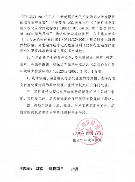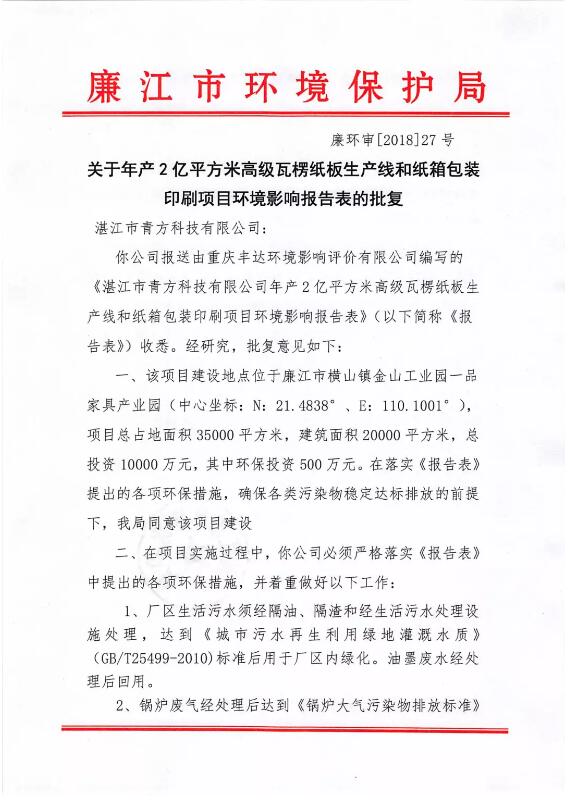 廣東省湛江市廉江市環(huán)境保護(hù)局于2018年12月29日發(fā)布了“關(guān)于年產(chǎn)2億平方米高級瓦楞紙板生產(chǎn)線和紙箱包裝印刷項(xiàng)目環(huán)境影響報(bào)告表的批復(fù)”。該項(xiàng)目總投資達(dá)1億元。