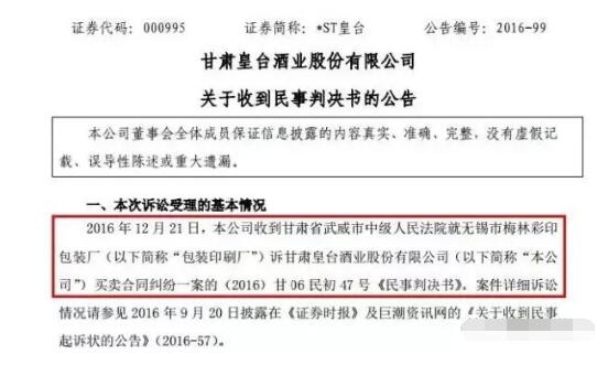*ST皇臺曾多次拒絕支付無錫市梅林彩印包裝欠款 *ST皇臺與無錫市梅林彩印包裝廠的糾紛可追溯到2015年。當年9月,無錫市梅林彩印包裝廠將*ST皇臺起訴至甘肅省武威市中級人民法院。原因是在2013年5月28日至2015年4月30日期間,無錫市梅林彩印包裝廠向*ST皇臺提供了總計34777806元的包裝物,*ST皇臺僅支付了18750280元貨款,尚欠貨款16027526元。 2015年5月13日,*ST皇臺向無錫市梅林彩印包裝廠出具付款承諾書,承諾在2015年8月30日前支付1372萬元。2016年9月,因*ST皇臺未支付欠款,無錫市梅林彩印包裝廠將其告上法庭。2016年12月23日,該案一審判決*ST皇臺支付上述金額,隨后*ST皇臺不服判決進行上訴。
