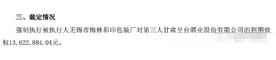 2019年1月3日晚,甘肅皇臺酒業股份有限公司(簡稱“*ST皇臺”)發布公告稱,公司收到法院送達的《執行裁定書》,將被強制執行償還無錫市梅林彩印包裝廠到期債權1362.29萬元。