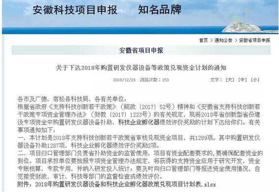 本計劃是2018年支持科技創(chuàng)新若干政策省審核兌現資金項目,共1289項。其中購置研發(fā)儀器設備補助1287項,科技企業(yè)孵化器績效評價獎勵2項。