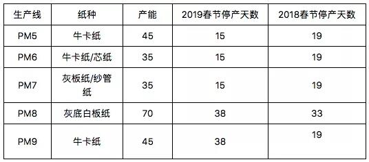1月3日,聯(lián)盛紙業(yè)(龍海)有限公司發(fā)布2019年春節(jié)期間停機通知: 公司五臺紙機將從2月1日起全部停機,其中兩臺產(chǎn)量最大的紙機PM8和PM9將停產(chǎn)38天。 與2018年春節(jié)相比,聯(lián)盛紙業(yè)的2019年春節(jié)總停產(chǎn)時間有所增加。五臺紙機合計停機109天。