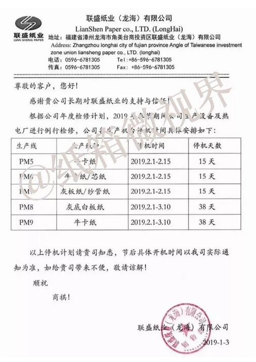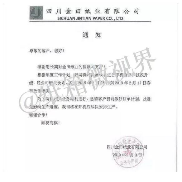 1月3日,四川金田紙業(yè)有限公司也發(fā)布停機通知: 2019年1月26日到2月17日停機。