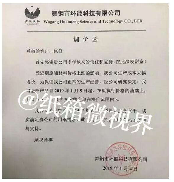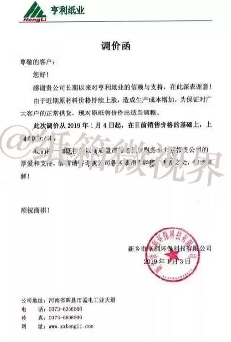 3家紙廠發(fā)漲價函,紙價漲50-100元/噸,部分包括未交付訂單 1月3日,新鄉(xiāng)市亨利環(huán)保科技有限公司發(fā)布漲價函: 1月4日起,在目前銷售價格的基礎(chǔ)上,原紙售價上調(diào)50元/噸。