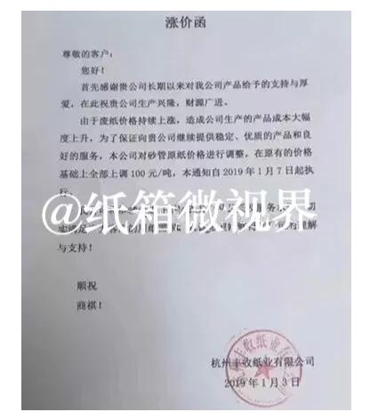 1月3日,杭州豐收紙業(yè)有限公司發(fā)布漲價函: 紗管原紙價格在原有價格的基礎(chǔ)上全部上調(diào)100元/噸,1月7日起執(zhí)行。