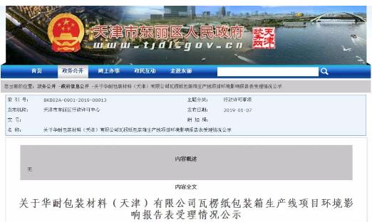 導語:華耐包裝材料(天津)有限公司投資150萬元進行建設的瓦楞紙包裝箱生產線項目已進入環評階段,預計2019年2月投產,其中環保投資28萬元,項目建成后,預計年生產紙制品300萬立方米。