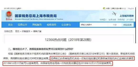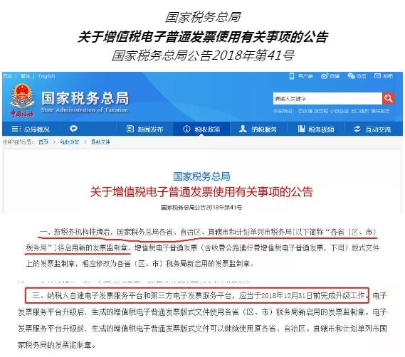 稅局具體通知 二、《國家稅務總局關于增值稅電子普通發票使用有關事項的公告》的具體通知 1、發布本公告的背景是什么? 為了保障國稅地稅征管體制改革工作順利推進,確保改革前后增值稅電子普通發票有序銜接、平穩過渡,發布本公告。 2、新稅務機構掛牌后,增值稅電子普通發票版式文件上的發票監制章有何變化? 新稅務機構掛牌后,國家稅務總局各省、自治區、直轄市和計劃單列市稅務局[以下簡稱“各省(區、市)稅務局”]將啟用新的發票監制章。增值稅電子普通發票(含收費公路通行費增值稅電子普通發票,下同)版式文件上的發票監制章,相應修改為各省(區、市)稅務局新啟用的發票監制章,納稅人自建電子發票服務平臺和第三方電子發票服務平臺需要進行相應升級。 3、新啟用的發票監制章是什么樣式? 新啟用的發票監制章形狀為橢圓型,長軸為3厘米,短軸為2厘米,邊寬為0.1厘米,內環加刻一細線,上環刻制“全國統一發票監制章”字樣,中間刻制“國家稅務總局”字樣,下環刻制“××省(區、市)稅務局”字樣,下環字樣例如:“江蘇省稅務局”、“上海市稅務局”、“內蒙古自治區稅務局”、“新疆維吾爾自治區稅務局”。字體為楷體7磅,印色為大紅色。 4、電子發票服務平臺的升級工作應當于何時完成? 納稅人自建電子發票服務平臺和第三方電子發票服務平臺的升級工作,應當于2018年12月31日前完成。 5、電子發票服務平臺升級前,發票監制章如何使用? 電子發票服務平臺升級前,生成的增值稅電子普通發票版式文件可以繼續使用原各省、自治區、直轄市和計劃單列市國家稅務局的發票監制章。 6、本公告自何時起施行? 本公告自發布之日起施行。 這些發票使用時間規定,也要注意 三、新規執行后,定額發票也不能繼續使用了嗎?請注意 網上爆出這樣一張聊天記錄,定額發票不能用了?(不對真實性負責)