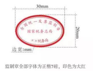 新發票監制章:形狀為橢圓形,與原發票監制章規格相同,內環加刻一細線。上環刻制“全國統一發票監制章”字樣,中間刻制“國家稅務總局”字樣,下環刻制“xxx稅務局”字樣,如“廣東省稅務局”、“廣州市稅務局”等。