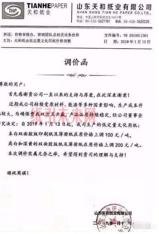 山東天和紙業有限公司:近期我公司持續受原材料、能源等多種因素影響,生產成本升幅較大,為確保貴我雙方互共贏,產品品質持續穩定,經公司董事會研究決定:自2019年1月13目起,我司生產的低定量文化用紙:本白雙面膠版印刷紙及薄冊紙在原價格上調100元/噸,高白和深黃的雙面膠版及薄冊紙在原價格上調200元/噸。