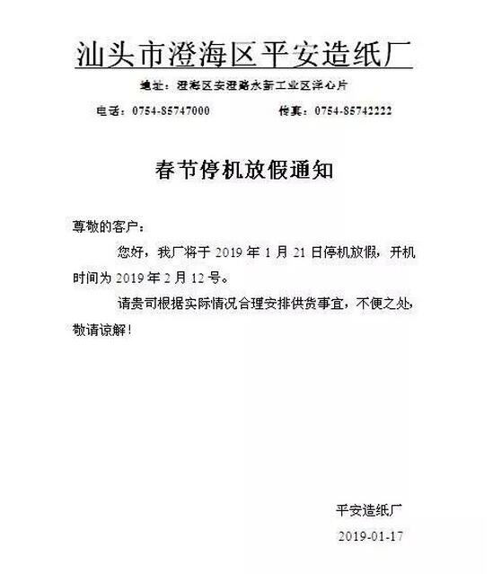 廣東汕頭平安紙業 福建華發紙業春節放假通知