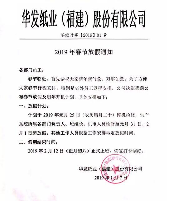 二、華發紙業(福建)股份有限公司2019年春節放假通知