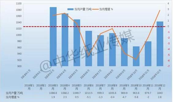 據近日國家統計局數據庫顯示,2018年1至12月我國機制紙及紙板(外購原紙加工除外,下同)累計產量為11660.6萬噸,累計增長-1.5%。這是自1998年(統計局數據庫可查詢到的數據)以來,全年機制紙和紙板產量首次出現負增長。(注:據中國造紙協會年度報告調查,2013年我國紙和紙板產量曾出現過負增長。)