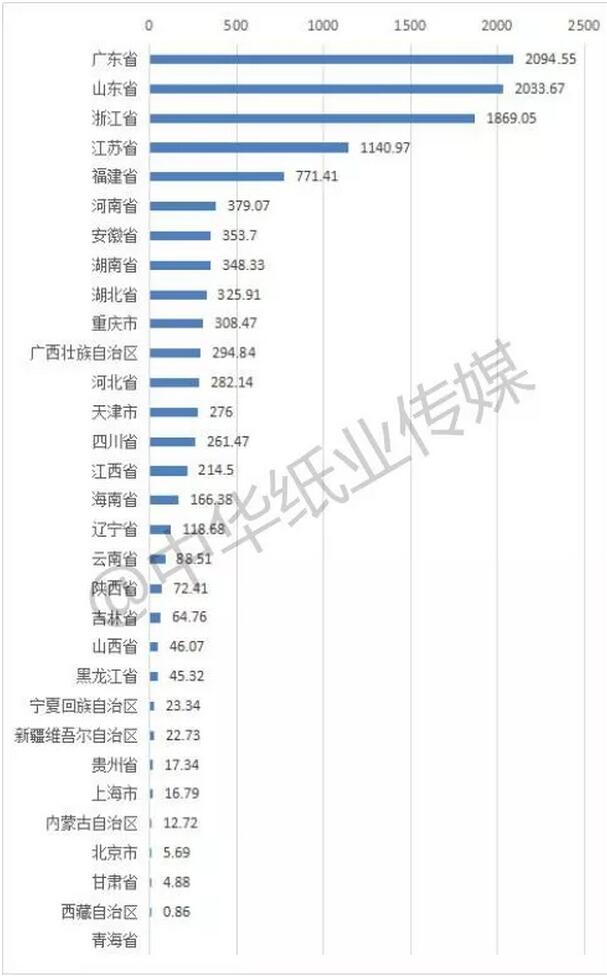 從各省(市、自治區)2018年的機制紙和紙板產量來看,除青海外,其他地區均有機制紙和紙板的生產。如圖3,廣東和山東的產量均超過2000萬噸,廣東以2094.55萬噸繼續領跑全國;浙江和江蘇的產量超過1000萬噸分別為1869萬噸和1141萬噸。粵、魯、浙、蘇這四個東部沿海省份的產量合計為7138萬噸,約占全國總產量的67%;值得注意的是,四個產量大省的總產量比2017年減少了約406萬噸,而在全國的占比卻上升了7個百分點。此外,產量排名前十的地區與2017年相比,湖北省以326萬噸的產量躋身前十,從2017年的第13上升到了第9位,河北省則從2017年第8下降到了第12位。產量排名前十的地區產量合計為9625萬噸,約占全國總產量的90%;前十合計產量比2017年減少了850萬噸,而在全國的占比也上升了6.5個百分點。反映出全國機制紙和紙板總產量下降的同時,集中度仍在進一步提高。