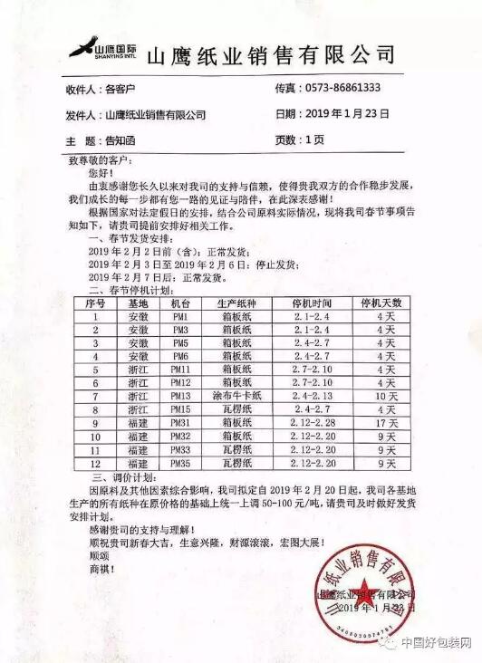 近日,山鷹紙業發布了2019年春節發貨安排的公函:根據國家法定節假日安排及公司原料實際情況,2月3日-2月6日停止發貨,2月7日正常發貨。