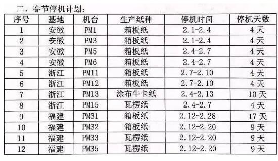 不過,與其不同的是,此次山鷹紙業還發布了停機計劃,安徽、浙江、福建三大基地共計12臺箱板紙、涂布?、瓦楞紙紙機檢修4-17天不等。
