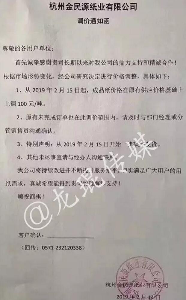 杭州金民源紙業(yè)有限公司:自2019年2月15日起,成品紙價格在原供應(yīng)價格基礎(chǔ)上上調(diào)100元/噸。