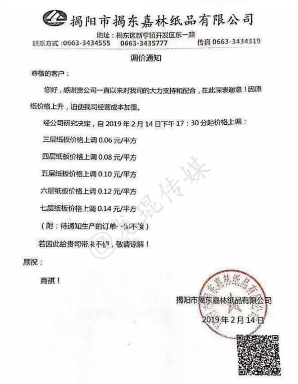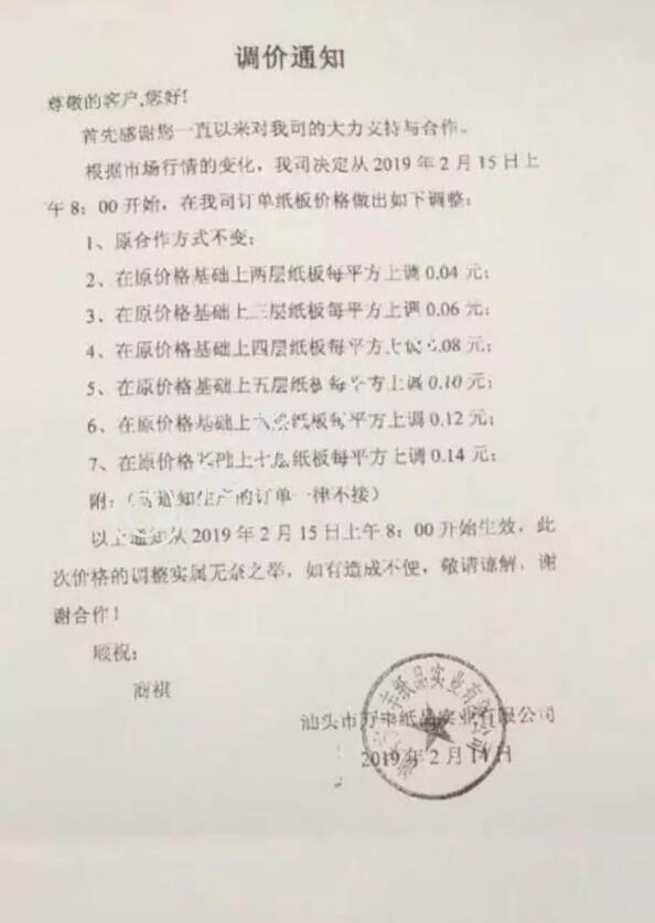 揭陽市揭東嘉林紙品有限公司:自2019年2月14日下午17:30起,三層紙板上漲0.06元/平方,四層紙板上漲0.08元/平方,五層紙板上漲0.10元/平方,六層紙板上漲0.12元/平方,七層紙板上漲0.14元/平方,待通知生產(chǎn)的訂單一律不接。