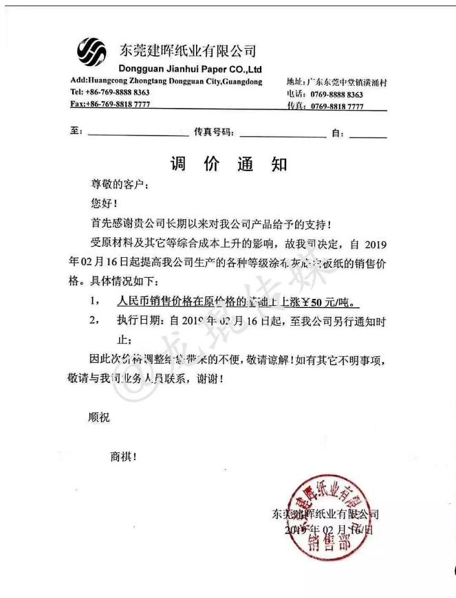 ▲大嶺山鎮 紙廠復產速度放緩,東莞建暉漲價50元/噸 這一起震驚業內外的7死2傷事故,不僅引發了廣東省省委的高度關注,也令東莞市的造紙行業籠罩在安監風潮中。據紙業內參了解: 東莞某紙廠春節復工后,原計劃逐臺開機,逐步提高車速恢復產能。目前因受事故影響,復產速度會放緩,還未開機的生產線將在集中安全檢查后再考慮投產。 而據另一家企業的消息,政府檢查力度很大,企業保證24小時有主要領導在公司,公司考慮廠區內的幾個安全隱患,短期將暫時減少廢紙、化學品等原材料的進廠。 值得一提的是,就在2月16日當天,東莞建暉紙業有限公司就宣布各等級涂布灰板紙在原價格基礎上上調50元/噸。 顯而易見,由這一起事故引發的安監風潮影響了東莞紙廠的正常生產,并已觸發了新一輪的原紙漲價。
