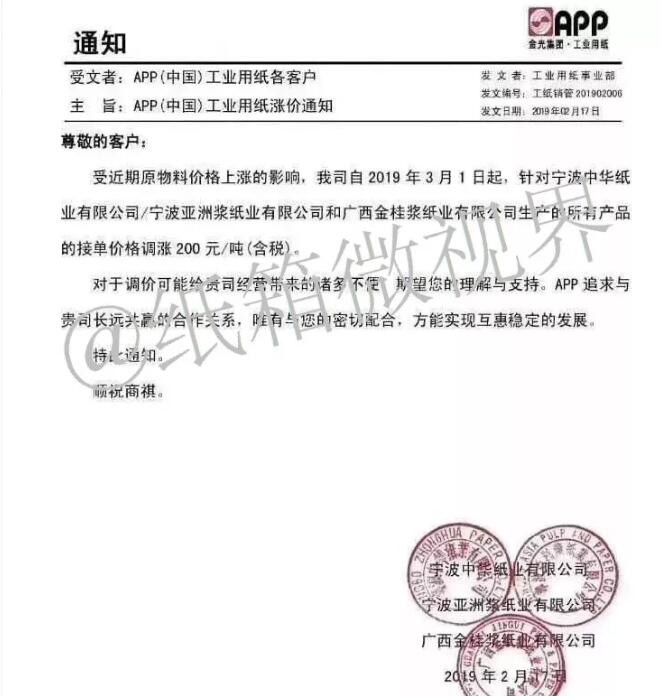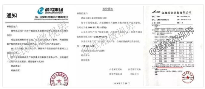 在漲價的背后,紙企的業(yè)績情況并不理想。 其中,博匯紙業(yè)預(yù)計2018年度實現(xiàn)歸屬于上市公司股東的凈利潤同比減少67.29%。而利潤下滑的主要原因,是原材料價格上升及產(chǎn)品的售價下降所致。 “現(xiàn)在的價格上調(diào)并不是供不應(yīng)求,而是紙業(yè)市場因環(huán)保及原料等原因?qū)е吕麧櫩臻g進(jìn)一步縮減,各大紙業(yè)只能提價保利潤。”一家上市紙企的高管在接受采訪時表示,原紙價格上漲傳播到下游紙板廠,而紙板廠議價能力偏弱,只能被動提價。 未來紙企或許會把業(yè)務(wù)延伸到下游紙板廠,完善產(chǎn)業(yè)鏈以提高利潤。 原材料推動紙價上漲,原紙價格全線上調(diào),陸續(xù)會有更多廠家跟漲 2月17日,APP(中國)工業(yè)用紙公司率先發(fā)布漲價函,隨后2月18日,晨鳴紙業(yè)、博匯紙業(yè)等紙企也紛紛跟漲,漲價幅度均為200元/噸。