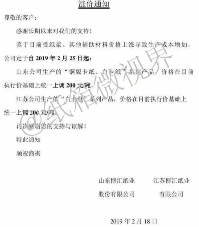 博匯紙業(yè)在2月18日發(fā)布的漲價函顯示,2019年2月25日起:山東公司生產(chǎn)的“銅版卡紙、白卡紙”系列產(chǎn)品,價格在目前執(zhí)行價基礎(chǔ)上統(tǒng)一上調(diào)200元噸。江蘇公司生產(chǎn)的“白卡紙”系列產(chǎn)品,價格在目前執(zhí)行價基礎(chǔ)上統(tǒng)一上調(diào)200元/噸。