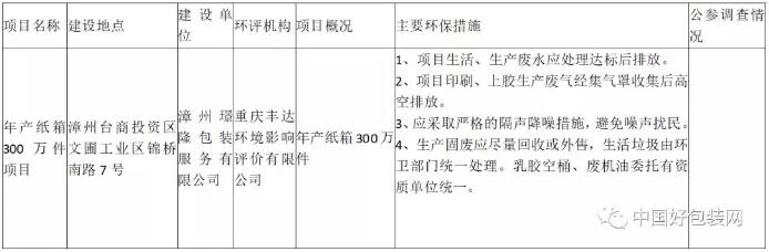 根據建設項目環境影響評價審批程序的有關規定,經審查,2月26日,福建省漳州臺商投資區環安局對一年產紙箱300萬件的項目作出環境影響評價文件作出審批意見。 據公示,該項目建設單位為漳州璟隆包裝服務有限公司,建設地點為漳州臺商投資區文圃工業區錦橋南路7號,預計年產紙箱300萬件。