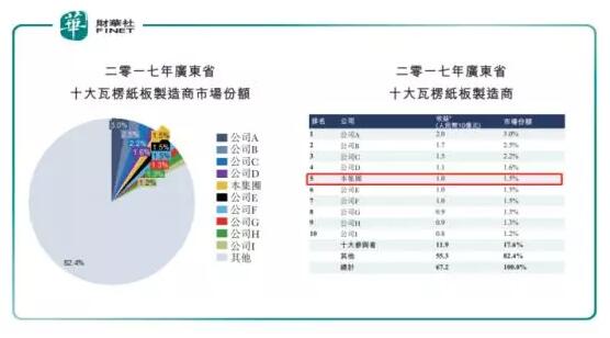 就消耗量而言,廣東省瓦楞紙板市場(chǎng)規(guī)模預(yù)計(jì)于2018年—2022年間以3.6%的年復(fù)合增長(zhǎng)率增長(zhǎng),將于2022年將達(dá)到272億平方米。就收益而言,廣東省瓦楞紙板市場(chǎng)規(guī)模預(yù)期將于2018年—2022年以4.1%的年復(fù)合增長(zhǎng)率增長(zhǎng),將于2022年達(dá)到895億元。 另外,廣東省瓦楞紙箱包裝的消耗量預(yù)期將2018年1310萬(wàn)噸增加至2022年的1510萬(wàn)噸,復(fù)合年增長(zhǎng)率約為3.7%。 作為廣東省瓦楞紙板市場(chǎng)主要的制造商,天晟集團(tuán)可依托廣東省瓦楞紙板市場(chǎng)規(guī)模的不斷壯大,進(jìn)而擴(kuò)增市場(chǎng)份額的同時(shí),間接提升公司的盈利能力。 雖然,行業(yè)發(fā)展前景向好,但廣東省整體瓦楞紙板市場(chǎng)是一個(gè)高度分散的行業(yè),行業(yè)競(jìng)爭(zhēng)壓力也不容小視。廣東省瓦楞紙板市場(chǎng)截至2017年12月31日,在廣東省內(nèi)約有300家瓦楞紙板供應(yīng)商。其中前10大供應(yīng)商市場(chǎng)份額僅占總規(guī)模的17.6%,剩余82.4%市場(chǎng)份額分散至大大小小瓦楞紙板供應(yīng)商。根據(jù)招股書(shū)獲悉,按2017年收益計(jì)算,天晟集團(tuán)在瓦楞紙板市場(chǎng)中排名第五,在廣東省的市場(chǎng)占有率僅為1.5%。