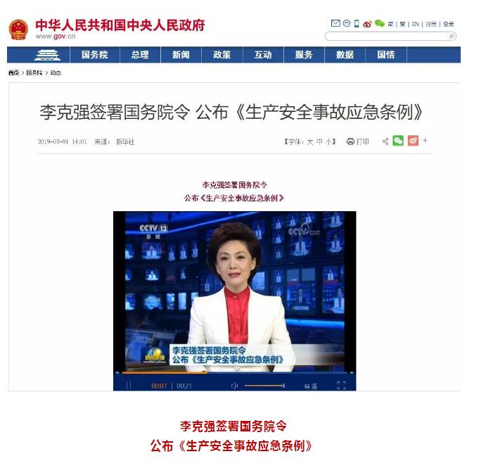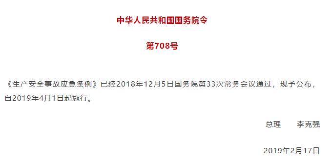 新華社北京3月1日電日前,國務院總理李克強簽署國務院令,公布《生產(chǎn)安全事故應急條例》(以下簡稱《條例》),自2019年4月1日起施行。 黨中央和國務院高度重視生產(chǎn)安全事故應急工作。為了解決生產(chǎn)安全事故應急工作中存在的突出問題,提高生產(chǎn)安全事故應急工作的科學化、規(guī)范化和法治化水平,《條例》以安全生產(chǎn)法和突發(fā)事件應對法為依據(jù),對生產(chǎn)安全事故應急工作體制、應急準備、應急救援等作了規(guī)定。 一是明確應急工作體制。《條例》規(guī)定,國務院統(tǒng)一領導全國的生產(chǎn)安全事故應急工作,縣級以上地方人民政府統(tǒng)一領導本行政區(qū)域內的生產(chǎn)安全事故應急工作。縣級以上人民政府行業(yè)監(jiān)管部門分工負責、綜合監(jiān)管部門指導協(xié)調,基層政府及派出機關協(xié)助上級人民政府有關部門依法履職。 二是強化應急準備工作。《條例》規(guī)定,縣級以上人民政府及其負有安全生產(chǎn)監(jiān)督管理職責的部門和鄉(xiāng)、鎮(zhèn)人民政府以及街道辦事處等地方人民政府派出機關應當制定相應的生產(chǎn)安全事故應急救援預案,并依法向社會公布。生產(chǎn)經(jīng)營單位應當制定相應的生產(chǎn)安全事故應急救援預案,并向本單位從業(yè)人員公布。《條例》還對建立應急救援隊伍、應急值班制度,從業(yè)人員應急教育和培訓,儲備應急救援裝備和物資等內容進行明確規(guī)定。 三是規(guī)范現(xiàn)場應急救援工作。《條例》規(guī)定,發(fā)生生產(chǎn)安全事故后,生產(chǎn)經(jīng)營單位應當立即啟動生產(chǎn)安全事故應急救援預案,采取相應的應急救援措施,并按照規(guī)定報告事故情況。有關地方人民政府及其部門接到生產(chǎn)安全事故報告后,按照預案的規(guī)定采取搶救遇險人員,救治受傷人員,研判事故發(fā)展趨勢,防止事故危害擴大和次生、衍生災害發(fā)生等應急救援措施,按照國家有關規(guī)定上報事故情況。有關人民政府認為有必要的,可以設立應急救援現(xiàn)場指揮部,指定現(xiàn)場指揮部總指揮,參加應急救援的單位和個人應當服從現(xiàn)場指揮部的統(tǒng)一指揮。 《條例》還對地方各級人民政府和生產(chǎn)經(jīng)營單位在應急準備、應急救援方面的法律責任作出規(guī)定。  生產(chǎn)安全事故應急條例 第一章 總則 第一條 為了規(guī)范生產(chǎn)安全事故應急工作,保障人民群眾生命和財產(chǎn)安全,根據(jù)《中華人民共和國安全生產(chǎn)法》和《中華人民共和國突發(fā)事件應對法》,制定本條例。 第二條 本條例適用于生產(chǎn)安全事故應急工作;法律、行政法規(guī)另有規(guī)定的,適用其規(guī)定。 第三條 國務院統(tǒng)一領導全國的生產(chǎn)安全事故應急工作,縣級以上地方人民政府統(tǒng)一領導本行政區(qū)域內的生產(chǎn)安全事故應急工作。生產(chǎn)安全事故應急工作涉及兩個以上行政區(qū)域的,由有關行政區(qū)域共同的上一級人民政府負責,或者由各有關行政區(qū)域的上一級人民政府共同負責。 縣級以上人民政府應急管理部門和其他對有關行業(yè)、領域的安全生產(chǎn)工作實施監(jiān)督管理的部門(以下統(tǒng)稱負有安全生產(chǎn)監(jiān)督管理職責的部門)在各自職責范圍內,做好有關行業(yè)、領域的生產(chǎn)安全事故應急工作。 縣級以上人民政府應急管理部門指導、協(xié)調本級人民政府其他負有安全生產(chǎn)監(jiān)督管理職責的部門和下級人民政府的生產(chǎn)安全事故應急工作。 鄉(xiāng)、鎮(zhèn)人民政府以及街道辦事處等地方人民政府派出機關應當協(xié)助上級人民政府有關部門依法履行生產(chǎn)安全事故應急工作職責。 第四條 生產(chǎn)經(jīng)營單位應當加強生產(chǎn)安全事故應急工作,建立、健全生產(chǎn)安全事故應急工作責任制,其主要負責人對本單位的生產(chǎn)安全事故應急工作全面負責。 第二章 應急準備 第五條 縣級以上人民政府及其負有安全生產(chǎn)監(jiān)督管理職責的部門和鄉(xiāng)、鎮(zhèn)人民政府以及街道辦事處等地方人民政府派出機關,應當針對可能發(fā)生的生產(chǎn)安全事故的特點和危害,進行風險辨識和評估,制定相應的生產(chǎn)安全事故應急救援預案,并依法向社會公布。 生產(chǎn)經(jīng)營單位應當針對本單位可能發(fā)生的生產(chǎn)安全事故的特點和危害,進行風險辨識和評估,制定相應的生產(chǎn)安全事故應急救援預案,并向本單位從業(yè)人員公布。 第六條 生產(chǎn)安全事故應急救援預案應當符合有關法律、法規(guī)、規(guī)章和標準的規(guī)定,具有科學性、針對性和可操作性,明確規(guī)定應急組織體系、職責分工以及應急救援程序和措施。 有下列情形之一的,生產(chǎn)安全事故應急救援預案制定單位應當及時修訂相關預案: (一)制定預案所依據(jù)的法律、法規(guī)、規(guī)章、標準發(fā)生重大變化; (二)應急指揮機構及其職責發(fā)生調整; (三)安全生產(chǎn)面臨的風險發(fā)生重大變化; (四)重要應急資源發(fā)生重大變化; (五)在預案演練或者應急救援中發(fā)現(xiàn)需要修訂預案的重大問題; (六)其他應當修訂的情形。 第七條 縣級以上人民政府負有安全生產(chǎn)監(jiān)督管理職責