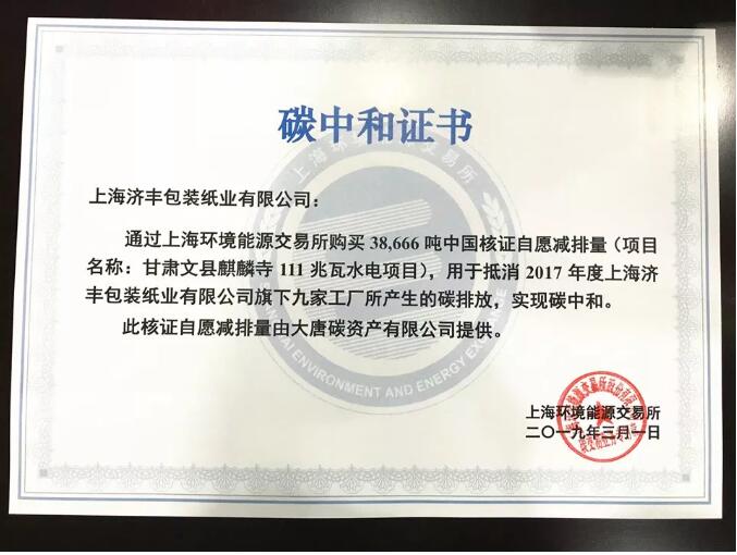 例如,此次濟豐包裝通過上海環境能源交易所購買38666噸中國核證自愿減排量(甘肅文縣麒麟寺111兆瓦水電站項目),用于抵消2017年度上海濟豐包裝紙業有限公司旗下九家工廠所產生的碳排放,實現碳中和。 截至2017年12月31日,濟豐包裝總共進行碳中和交易額度283191噸。十年的堅持,國際濟豐包裝集團通過碳中和在降低治理污染社會總成本、延緩氣候變化和環境保護等方面做出了自己的一份貢獻!