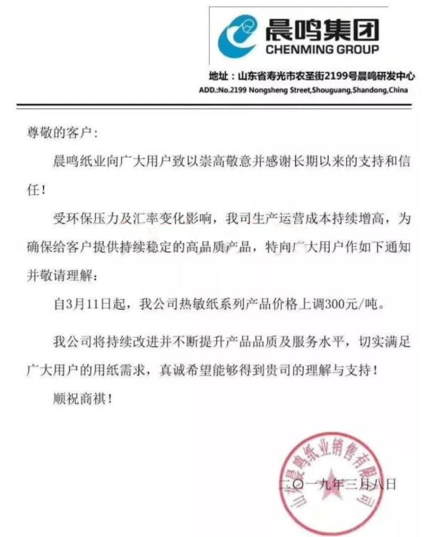 春節后經銷商及下游印廠補庫存,并且每年3月出版社為秋季教材招標,文化紙將迎來了春季小旺季;仡2月末,國內包括晨鳴、華泰、APP、太陽、亞太森博、中冶銀河、江河、大河等多家主要雙膠紙、銅版紙廠商相繼發布提價通知,提價多自3月1日起執行,漲幅仍為200元/噸。 第一輪提價函 雙膠紙、銅版紙提價,雙膠紙部分落地。1月中旬起,雙膠紙、銅版紙密集發布2月提價函,分別提價200元/噸、100元/噸,截止目前雙膠紙已經基本落地50-150元/噸,但銅版紙提價暫未落地。 第二輪提價函 銅版紙、白卡紙已發提價函,落地幅度有待觀察。節后漿紙系紙企再次密集發布銅版紙、白卡紙3月提價函,提價200元/噸。雙膠紙2月份價格回調,終端漲幅落實100-200元/噸。市場顯露短期回暖跡象,多家紙廠推漲3月價格意向堅定,3月出廠價漲幅仍為200元/噸。 第三輪提價函 晨鳴、APP、江河紙業在昨天均發布了最新的漲價函,宣布熱敏紙、復印紙、無碳復寫紙等將上調價格,漲價幅度最高為300元/噸。 山東晨鳴紙業銷售有限公司