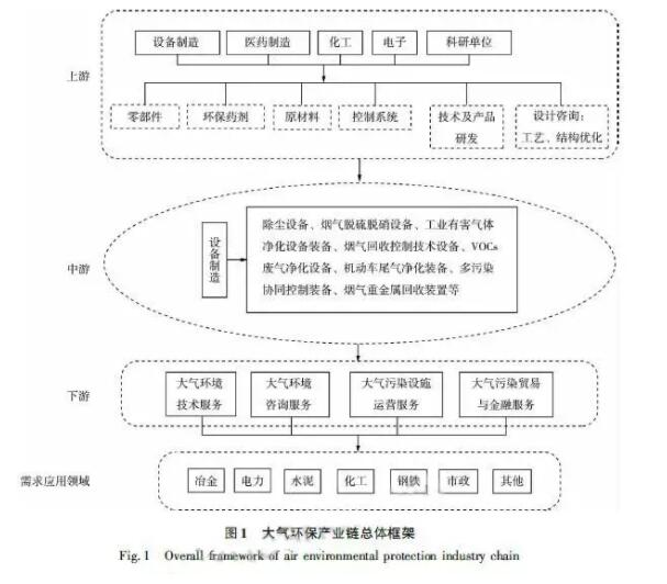 導讀:基于對大氣環保產業鏈概念和內涵界定的基礎上,從主導功能、產品類型、市場情況等方面分析了大氣環保產業鏈上、中、下游不同環節的特點及發展現狀。 在大氣污染治理需求迫切,國家大力推動大氣環保產業發展的背景下,基于對大氣環保產業鏈概念和內涵界定的基礎上,從主導功能、產品類型、市場情況等方面分析了大氣環保產業鏈上、中、下游不同環節的特點及發展現狀。大氣環保產業鏈的上游是供應鏈,主要為中、下游企業提供原材料、零部件、技術及產品的研發等;中游是生產鏈,主要包括除塵、脫硫、脫硝、VOCs治理等設備的生產;下游是服務鏈,主要包括大氣環境技術、大氣環境咨詢、大氣污染設施運營、大氣環境貿易與金融服務業4類。在分析大氣環保產業鏈各環節發展存在問題的基礎上,從加強技術創新驅動,提升大氣環境服務業的綜合服務能力,健全政策、法規體系等方面提出了優化產業鏈的建議。 大氣環保產業作為經濟合作與發展組織(OECD)對環保產業按要素分類的一個重要領域,近年來在推進我國大氣污染防治工作,改善大氣環境質量,促進經濟社會可持續發展方面起到了積極的作用。國務院發布的《關于印發大氣污染防治行動計劃的通知》(國發〔2013〕37號)明確指出,要形成政府統領、企業施治、公眾參與的大氣污染防治機制,在國家宏觀政策的鼓勵和引導下,大氣環保產業迎來了快速發展的新契機。但就大氣環保產業的發展來看,還存在技術創新不足、研發投入不足、產業鏈條不完善等問題。國內外專門針對大氣環保產業研究的學者還不多,相關研究多集中于大氣環保產業發展的制約因素、財政政策、發展現狀等方面,鮮有對大氣環保產業鏈結構的分析以及產業鏈優化等方面的研究。因此,筆者通過深入剖析大氣環保產業鏈的結構現狀,包括上、中、下游各環節的組成、關系,識別產業鏈缺鏈、斷鏈的環節,提出了完善我國大氣環保產業鏈的全產業鏈優化對策,以期為深化大氣環保產業理論,促進大氣環保產業的發展,優化我國大氣環保產業鏈提供方法借鑒。 1概念和內涵 1.1大氣環保產業鏈概念界定 1992年OECD將環保產業的概念界定為在終端控制、末端治理,具體是指在環境污染控制和減排、污染治理以及廢物利用等方面提供產品和服務的行業,這是大多數歐洲國家采用的狹義的定義。廣義上,環保產業不僅包括狹義環保產業的定義,還包括清潔技術、清潔產品和生態環境建設等內容。我國學者對環保產業的界定主要基于廣義的定義,認為環保產業是以防止環境污染、改善生態環境等為目的技術開發、產品生產、資源利用、信息服務、工程承包等活動的總稱。基于此,目前我國關于大氣污染治理產業的概念界定主要基于OECD的環保產業定義,側重于大氣污染的末端治理、終端控制。而大氣環保產業,主要是基于廣義環保產業的定義,指為大氣污染控制和減排(包括源頭預防、過程控制、末端治理等全過程),以大氣環境質量改善為目的提供技術、產品、服務等的產業。 對大氣環保產業鏈的概念進行界定,還需要對產業鏈有清晰的認識。產業鏈一詞據考證最早是由我國學者提出的,但國內學者對于產業鏈的概念尚未形成統一的認識,通過對比分析國內學者給出的定義,劉貴富提出產業鏈的科學定義為同一產業或不同產業的企業,以產品為對象,以投入產出為紐帶,以價值增值為導向,以滿足用戶需求為目標,依據特定的邏輯聯系和時空布局形成的上下關聯的、動態的鏈式中間組織。 大氣環保產業從產業類型來看,主要包括設計咨詢(生產工藝、結構優化咨詢)、技術、清潔產品研發、原料生產供應、大氣環保設備、產品生產、大氣環保服務等。由此可見,大氣環保產業體系涵蓋了大氣污染全過程控制所涉及的行業和部門,包括原材料供應商、技術及產品研發企業、設備生產企業、零部件供應商、服務提供商(前端設計咨詢、后端運營、管理等)等行業和部門。結合大氣環保產業、產業鏈的定義以及其他學者的相關研究,可將大氣環保產業鏈界定為:由為大氣污染控制和減排全過程提供技術、產品、設備、信息、服務的多部門組成,以產品和技術為投入,向用戶提供大氣污染治理的產品、服務,以價值增值為導向,以滿足用戶對大氣環境質量改善為需求的鏈式結構。 1.2大氣環保產業鏈內涵解析 根據大氣環保產業鏈的定義,其含義主要包括:1)是由不同行業類型的企業構成,包括技術及產品研發企業,提供原材料、零部件的制造業企業,還有設計咨詢、運行、維護、監測等的服務業企業,是一個涵蓋各領域、跨行業、相互交叉和滲透的綜合性產業組織;2)大氣污染綜合治理力度加大和對多污染物排放控制的加強是大氣環保產業鏈構建或者發展的動力,因此大氣環保產業鏈以滿足用戶對大氣污染控制和減排為目標,其主導產業功能屬性為降低大氣污染物的排放,改善大氣環境質量;3)以價值增值為導向,從理論上說產業鏈上的企業從上游到中游再到下游是一個不斷增值的過程,直到下游的終端產品、服務被購買,實現產業鏈的價值為止。 2大氣環保產業鏈結構、類型分析 2.1大氣環保產業鏈總體框架 大氣環保產業鏈由上游供應鏈、中游生產鏈、下游服務鏈3個環節組成,產業鏈總體框架見圖1。  2.2產業鏈不同環節特征分析 2.2.1上游供應鏈 大氣環