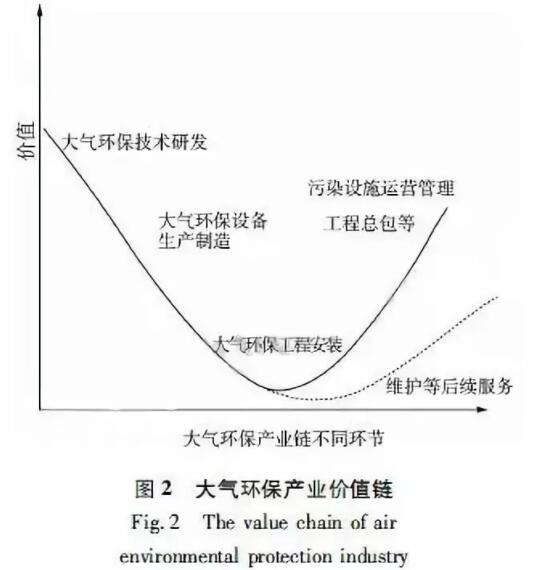 大氣環境服務業是大氣環保產業發展中最具潛力的組成部分,其發展起步較晚,發展迅速。2011年大氣環境服務業占大氣環保產業的15%左右,到2016年環境服務業占環保產業的比例已超過50%,大氣環境服務業占比也有較大幅度的提升,但與發達國家相比仍有一定差距。大氣環境服務業的主要客戶是面對工業企業,包括電力行業、水泥、建材、有色冶金、鋼鐵、化工等。隨著大氣環境服務業的發展,服務主體也從單一的科研設計單位發展到現在的企業與科研單位合作。且隨著環境服務的訴求日益綜合和專業化,大氣環境綜合服務業會成為拓寬產業涵蓋面,促進產業向更高層次發展的突破口。 2.3大氣環保產業價值鏈分析 根據上述分析,大氣環保產業鏈的構建目標就是為了實現價值的增值,因此產業鏈與價值鏈緊密相連,相互作用,相互影響。大氣環保產業鏈形成的是自下而上的拉動式消費關系,下游服務鏈直接面向用戶和市場,是滿足用戶需求的終端,其需求是由滿足國家大氣污染物總量控制、減排要求和大氣環境保護目標而產生的,然后再將需求傳遞到中、上游。其價值的實現過程是:當上游企業向中游企業提供原料、零部件和技術時,其投入的要素就由上游企業向中游企業轉移,上游企業順利地實現價值,而中游企業在吸收上游企業的要素下,生產大氣污染治理設備并向下游企業或消費者轉移以實現價值,下游以用戶購買服務實現價值,亦是形成整個產業鏈的最終目標,產業鏈的導向以此為基準,是整個產業鏈的價值增值最為關鍵的一環。 隨著我國大氣污染綜合治理力度的加大和對多污染物排放控制的加強,大氣污染治理產品和服務的市場需求量也在不斷加大。大氣污染治理產品、工程和服務是屬于全國甚至全球性的產品,其市場需求不只局限于本地市場。大氣污染治理行業消費者的成熟程度以及對相關產品、服務需求的苛刻又會迫使上、中、下游的環保企業不斷加強創新,提高產品技術含量和質量,提高服務品質,從而提高整個行業的競爭優勢,促進整個產業鏈的提升。 由于大氣環保產業組織的復雜,且受市場、政策等因素的影響,其價值鏈的實現即價值增值過程呈微笑曲線狀(圖2)。