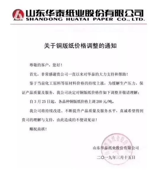 銅版紙 APP:鑒于當前市場木漿價格持續上漲,紙廠生產運營成本加大;自2019年3月25日起,CCBU主要紙種接單價統一進行調漲,具體調整幅度如下: 1)雙亞銅價格漲幅不低于200元/噸; 2)NEVIA雙膠調漲200元/噸; 3)單銅、白牛調漲100元/噸; 4)無論新老訂單,2019年4月1日起發貨的必須按新的價格執行。